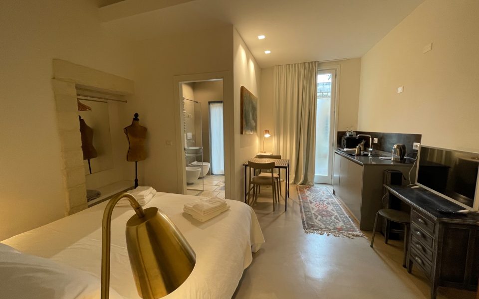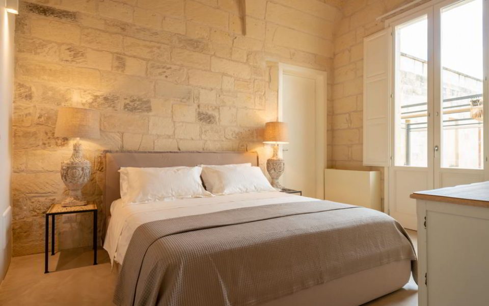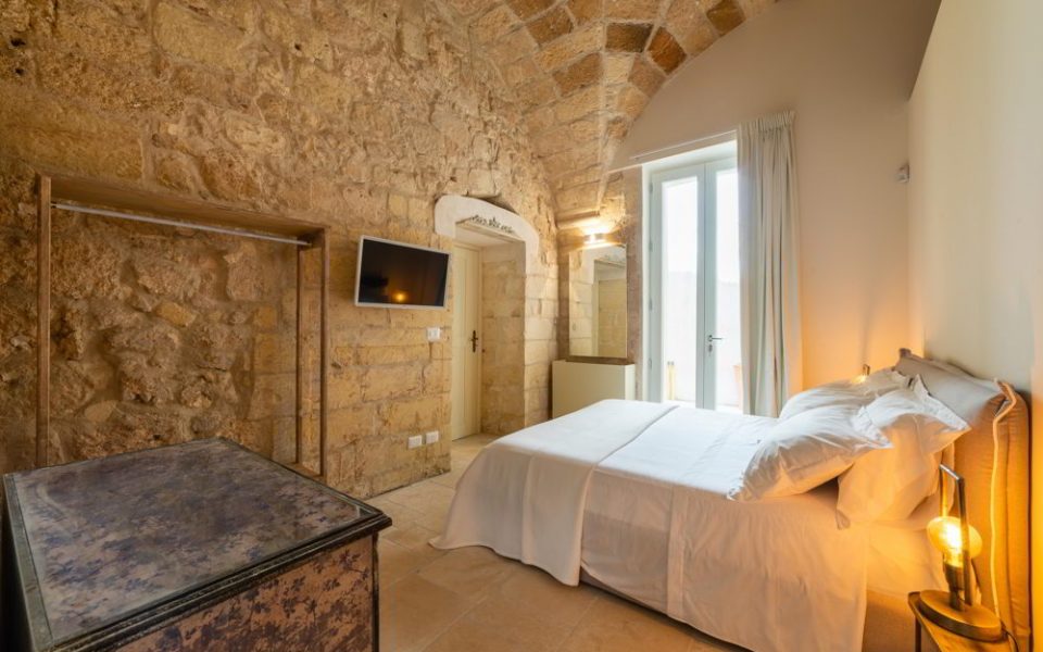 Dal gusto delicato e romantico, la Superior Suite si distingue per le pareti in pietra a vista e per l’ingresso indipendente attraverso una tipica corte salentina.